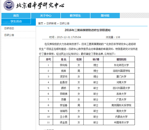 日语专业14级研究生颜娇同学获得三菱商事赞助进修生资格 2015年12月31日,经日语系和学校推荐并通过北京日本学研究中心材料筛选,日语专业14级学术研究生颜娇同学获得2016年度三菱商事赞助进修生资格,将于2016年2月末本学年度下个学期前往北京日本学研究中心进行为期半年的学习。 该项目由日本三菱商事(北京)有限责任公司赞助,以培养和发现有志于日本学研究的青年研究者为目的,面向全国在读三年制学术型研究生及博士研究生招生,研究方向包括日本语言学、教育学、文学、文化、社会、经济等多个领域。 顔娇的胜出是川外日语系与名校同专业研究生同台竞争的优势结果,更是与全国90余所高校推荐同专业研究生比较的结果,也是川外和日语系的骄傲与荣耀。我们相信三菱商社资助、日本学研究中心录取她进修,会令顔娇同学有更多拓展学习视野的良机和丰富研究领域内容的更大空间。同时我们今后也会为同学们外出研修提供更多机会,丰富大家的学习内容和生活。希望我系研究生通过在本校的踏实治学与在外校的交流学习相结合的方式,不断的扩充知识、开阔眼界,顺利地完成相关研究课题。