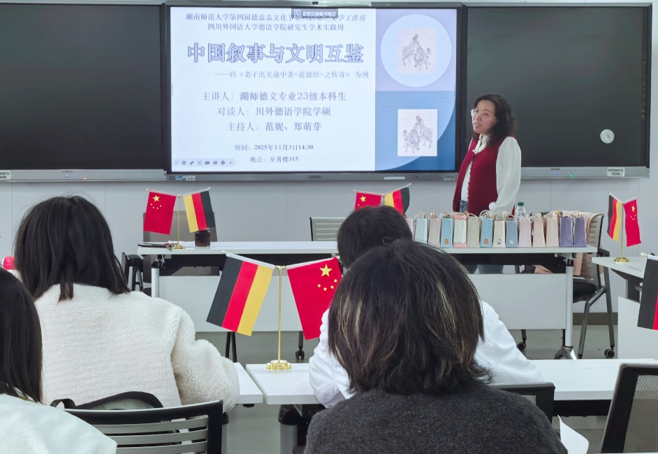 2025年11月3日,德语学院郑萌芽老师及研究生远赴湖南师范大学,参加“中国叙事与文明互鉴”文学工作坊。