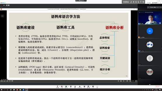 4月19日下午,西南大学外国语学院胡显耀教授应邀参加雷竞技在线进入游戏语料库语言学系列讲座第三场。本次系列学术活动由雷竞技比分主办,英语学院承办,科研处、语言智能学院、外国语文研究中心等单位协办。胡显耀教授做了题为“语料库文体统计学与应用”的线上讲座,该讲座由我校英语学院硕士导师苏杭教授主持,600余位校内外师生通过腾讯会议平台参加了本次讲座。