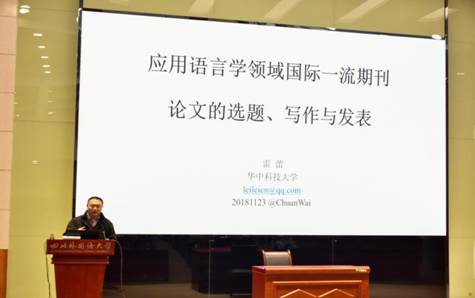 2018年11月23日下午3点,华中科技大学博士生导师雷蕾教授应邀在我校宏文楼国际报告厅做了题为“应用语言学领域国际一流期刊论文发表”的学术讲座。讲座由研究生院院长王仁强教授主持,我校吴淑琼教授、张宏教授、马武林教授、苏杭教授、董曼霞副教授、邓宇博士及校内外博士、硕士研究生等近百人参加了本次学术活动。王仁强院长对雷蕾教授的到来表示了热烈欢迎,并强调了解一流期刊论文发表相关知识的重要性。