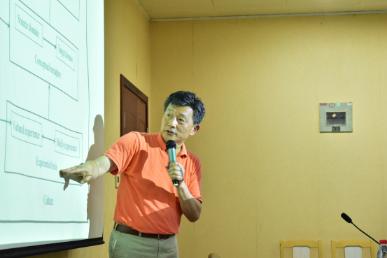 此次讲座主要分为三个部分。首先於宁教授指出Joseph Grady提出的primary metaphor(基础隐喻)对Conceptual Metaphor Theory(概念隐喻理论)的发展具有重要作用。接着他阐释了primary metaphor是sensorimotor experience与subjective experience之间的基础联系。於宁教授通过词典和语料库结合的方法对比了关于difficulty的两个基础隐喻—“DIFFICULTY IS WEIGHT”和“DIFFICULTY IS SOLIDITY”在英语和汉语中的异同。最后於教授分析了产生这些异同的原因,他表示隐喻是在人与物的互动中产生的,在分析的时候要考虑人自身的经验和文化环境的影响。