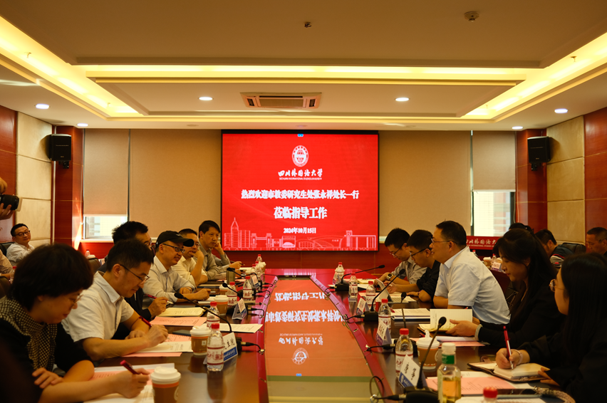 10月15日下午,重庆市教委学位管理与研究生教育处处长张永祥、副处长谭莉莉,学位管理与研究生教育处干部季林枫、唐筝、刘上、刘尚静一行六人来到四川外国语大学调研学科建设、学位管理与研究生教育情况。四川外国语大学校长董洪川,副校长胡安江,研究生院、教育规划与评估院、教务处、人事处、科研处、国际合作与交流处、计划财务处主要负责人,区域国别研究院、当代中国研究院及各研究生培养学院主要负责人参与调研。座谈会在图书馆505会议室召开,研究生院副院长陈明志主持会议。